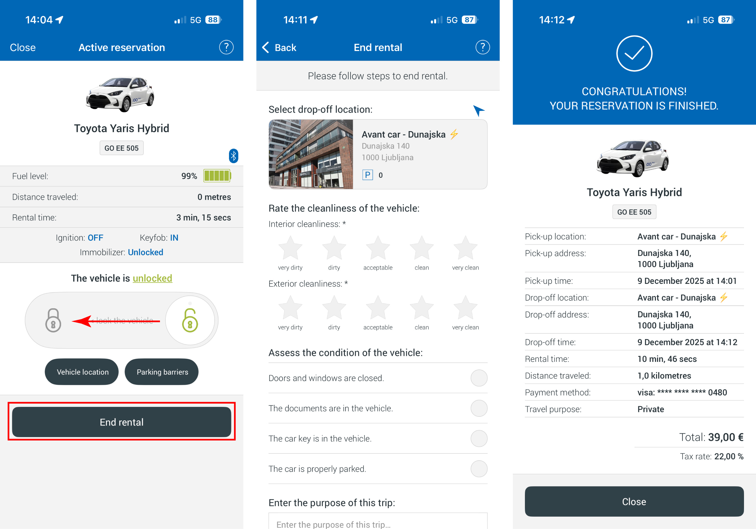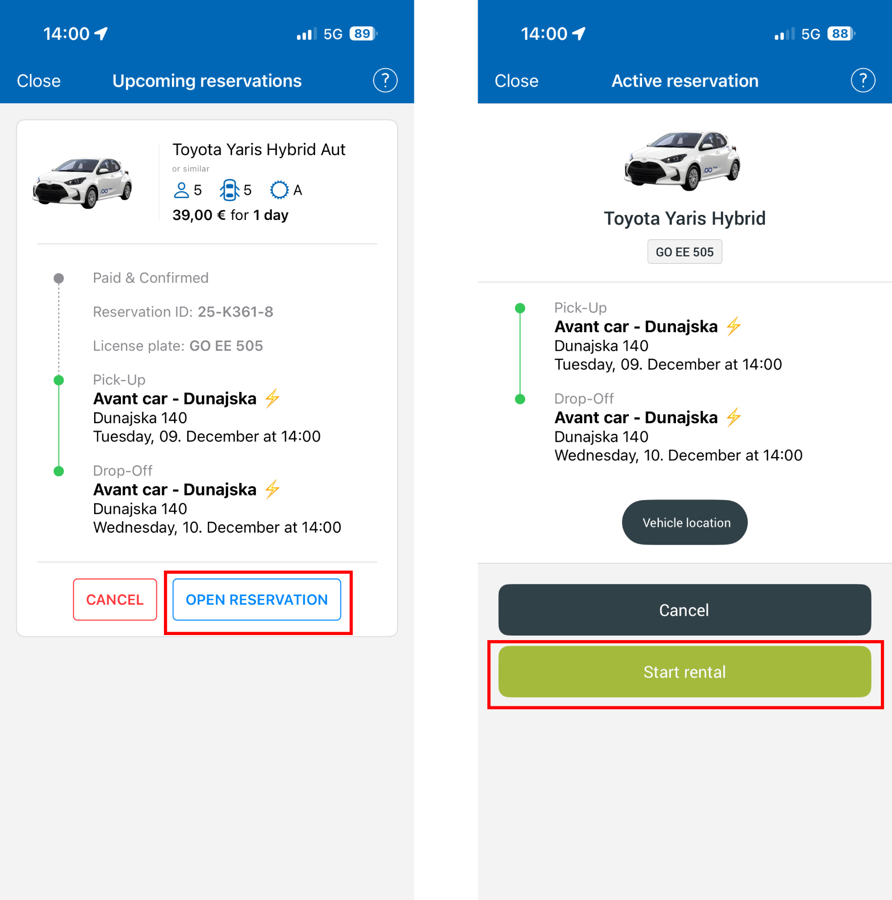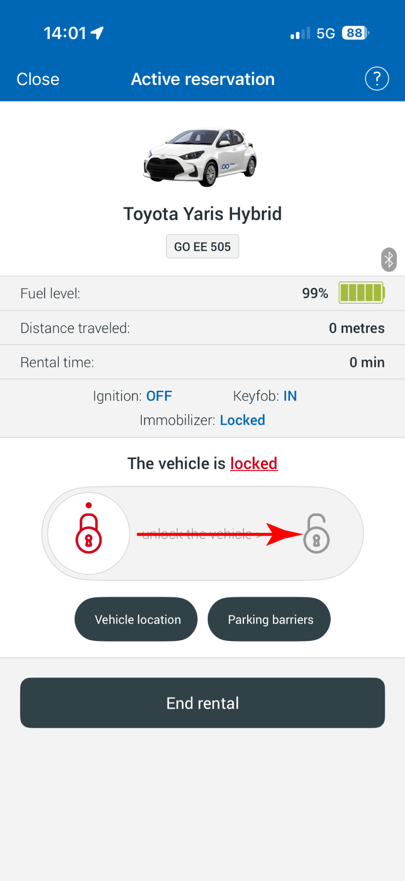 За самото преземање на возилото не е потребна посета на филијала, бидејќи возилото ќе ве чека на паркинг местата на наведените Avant2Go локации. Наемот (почеток, отклучување, заклучување, завршување) се извршува едноставно преку апликацијата, на сличен начин како кај услугата за споделување возила. Напомена: корисникот може истовремено да има активно изнајмено само едно возило (или во рамки на car sharing, или .GO Rent).